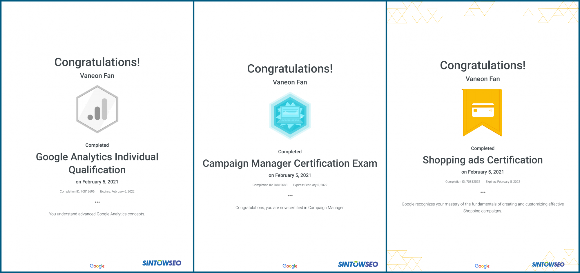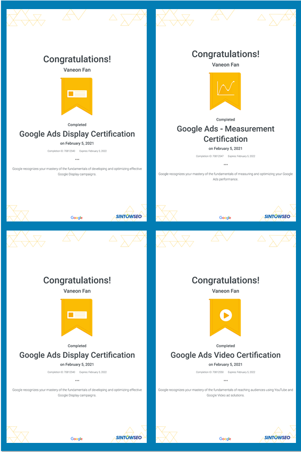 恭喜SINTOWSEO技術(shù)總監(jiān)順利通過(guò)購(gòu)物廣告認(rèn)證、谷歌廣告-測(cè)量認(rèn)證、谷歌廣告展示認(rèn)證、谷歌廣告視頻認(rèn)證。